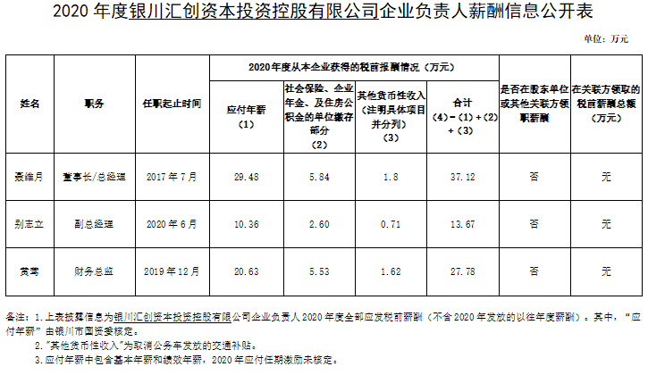 銀川匯創(chuàng)資本投資控股有限公司企業(yè)負責人2020年度薪酬情況